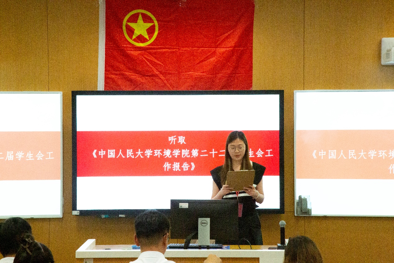 随后,环境学院第二十二届学生会主席团成员王苗亦代表第二十二届主席团向大会作学生会工作报告,总结了过去一年里学生会在制度创新、学术实践、文体活动、志愿服务等方面的工作情况,并对学生会未来发展进行了展望。第二十二届研究生会主席团成员白子萌代表第二十届研究生会向大会作研究生会工作报告,总结了上一学年里研究生会在思想学习、制度建设、学术科研、就业服务、环保公益等方面的工作成效,并对研究生会未来发展进行了展望。