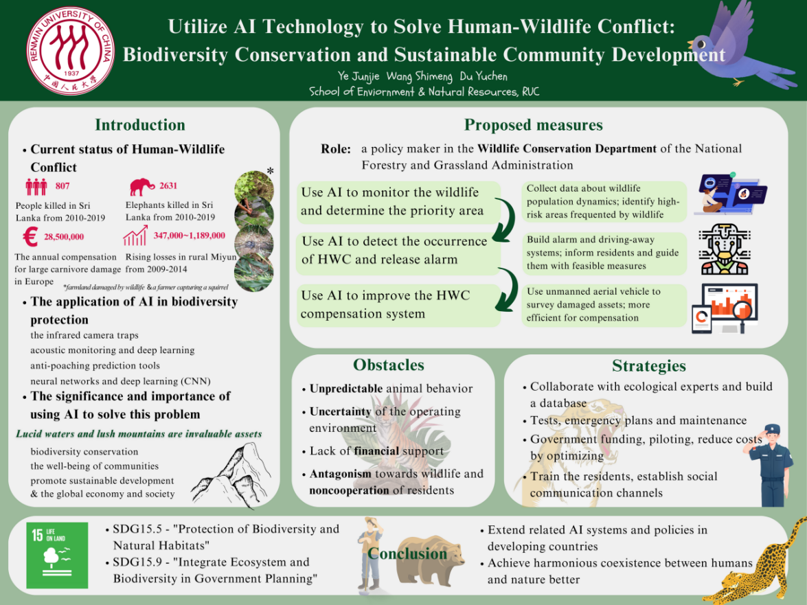 本届“明德立言”高校青年国际胜任力大赛围绕主题“Technology for a better future”展开。在潮人论坛 孟秀祥教授和研究生路晓平、吴佳忆、周鑫的指导下,Fly Away Home队围绕规定议题“Achieving environmental sustainability and biodiversity with artificial intelligence (AI) technology”,以提案“Utilize AI technology to solve Human-Wildlife Conflict: Biodiversity conservation and sustainable community development”和学术海报的形式,进行了议题分析。