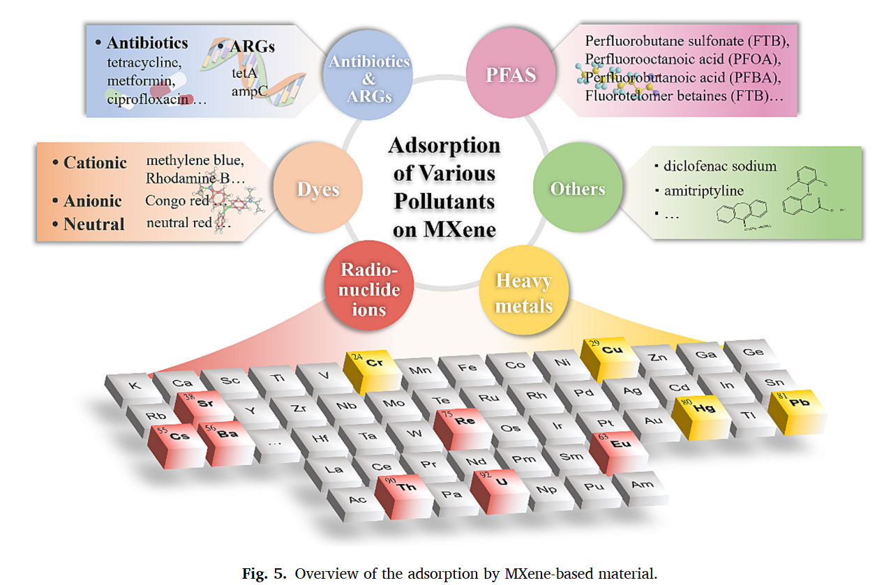 廖明嘉等同学撰写的这篇综述文章基于MXene基吸附剂领域的最新研究,全面总结了该材料的合成和改性方法,重点聚焦于MXene基吸附剂在水处理中的应用。论文写作团队详细总结了其对放射性核素、重金属、有机染料、全氟化合物、抗生素和抗性基因等多种污染物的吸附去除效果及去除机理,并深入讨论了MXene基吸附剂的潜在环境毒性。值得注意的是,MXene基吸附剂的研究在近十年才刚刚起步,目前正处于快速发展阶段。这篇文章有力填补了相关综述的空白,为MXene基吸附剂的发展提供了关键性的总结。