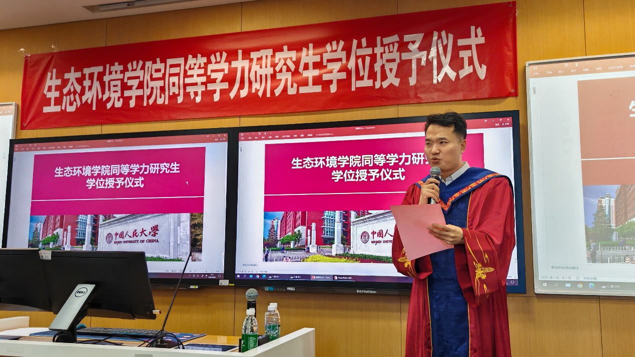毕业生代表宋思达分享了自己求学之路的感悟。他回顾了入学以来自己克服专业基础薄弱、工作繁忙等困难,利用一切时间学习备考,顺利通过国家考试,并最终获得硕士学位的历程。他向悉心指导自己学位论文的学院老师们表示崇高的敬意和衷心的感谢:“每一处论文批注都是最珍贵的财富。”最后,宋思达引用王安石的诗句“不畏浮云遮望眼,自缘身在最高层”,表达了对学术攀登的坚定信念,并呼吁同学们以所学知识服务可持续发展,做“绿色追梦人”。