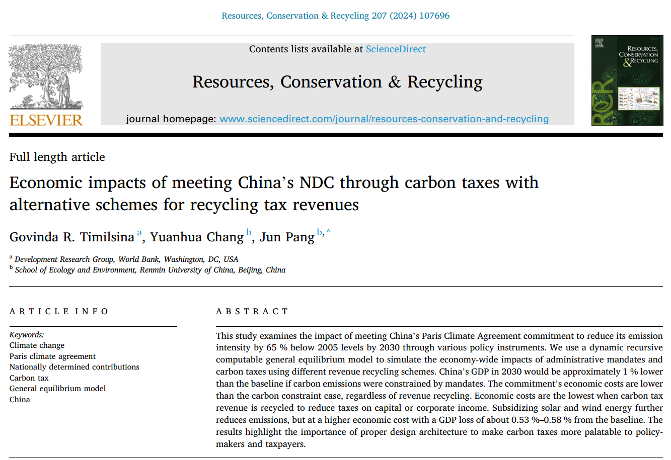 Abstracts:This study examines the impact of meeting China’s Paris Climate Agreement commitment to reduce its emission intensity by 65 % below 2005 levels by 2030 through various policy instruments. We use a dynamic recursive computable general equilibrium model to simulate the economy-wide impacts of administrative mandates andcarbon taxes using different revenue recycling schemes. China’s GDP in 2030 would be approximately 1 % lower than the baseline if carbon emissions were constrained by mandates. The commitment’s economic costs are lowerthan the carbon constraint case, regardless of revenue recycling. Economic costs are the lowest when carbon tax revenue is recycled to reduce taxes on capital or corporate income. Subsidizing solar and wind energy furtherreduces emissions, but at a higher economic cost with a GDP loss of about 0.53 %–0.58 % from the baseline. Theresults highlight the importance of proper design architecture to make carbon taxes more palatable to policy-makers and taxpayers.