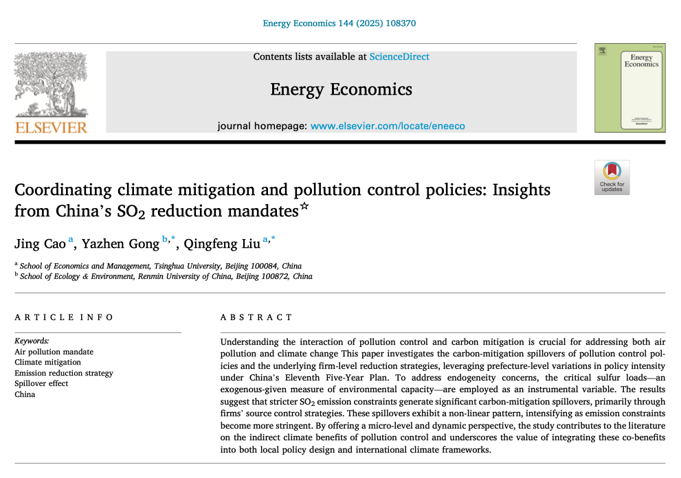 Cao J, Gong Y, Liu Q. Coordinating climate mitigation and pollution control policies: Insights from China's SO2 reduction mandates[J]. Energy Economics, 2025: 108370. //doi.org/10.1016/j.eneco.2025.108370