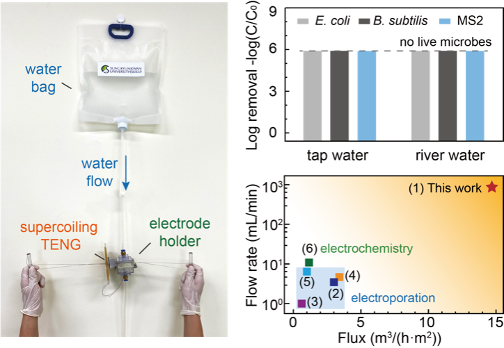 病原微生物可引发多种疾病,危害人类健康。在卫生设施和电力供应不足的发展中地区,人们无法使用安全清洁的饮用水,这一问题加剧了病原微生物感染的风险。消毒是杀灭水中微生物、保障用水安全的关键措施。常规消毒技术可在特定条件下实现高效消毒,但存在有消毒副产物风险高、杀灭细菌易复活、以及能耗高等问题。基于现有研究现状,霍正洋研究团队开发了一种新型消毒装置,利用无处不在的摩擦静电,实现水中的细菌和病毒的高效消毒。