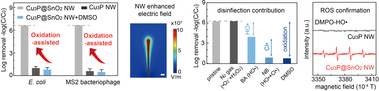 这项研究受到许多人小时候都玩过的转扣子游戏的启发:转扣子游戏中,将一根细绳穿过扣子的两个孔,把扣子放在两股绳子中间,转动扣子让两股绳缠绕在一起,然后有节奏地拉扯绳子,扣子就快速转动起来。在这个玩具的启发下,研究团队基于摩擦起电现象,设计了高速转动的发电机,并有效收集摩擦静电,将其与纳米线材料修饰的电极接通。利用具有细长形貌的纳米线材料,将自由电荷聚集于曲率半径最小的尖端区域,进而强化局部电场。当水中细菌与病毒经过强电场时,即可实现高效、快速消毒,处理流速达1 L/min。在本项工作中,研究团队仅仅靠一个便携的手动装置,即可实现对水中细菌与病毒的即时、快速处理,可服务于灾区或疫区,以及卫生设施不足的贫困地区。
