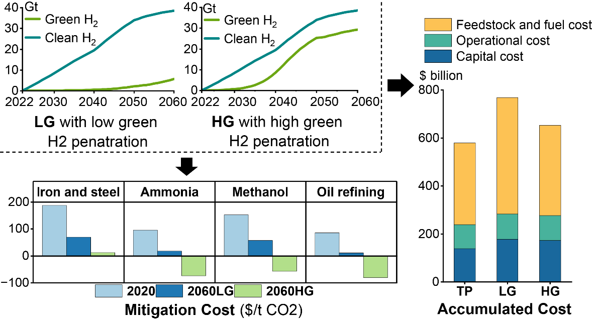 清洁氢,包括绿氢和蓝氢,为难以减排的(HTA)行业脱碳提供了选择。然而,当前对蓝氢和绿氢的扩散途径和跨行业比较的关注有限。因此,本研究针对中国四个难以减排的工业行业,将氢的需求和供给双方同时纳入考虑,构建了自下而上的技术经济评估模型。其中,使用S型增长曲线模拟蓝氢和绿氢共同发展的清洁氢供应路径,并设计了两种具有不同蓝氢和绿氢占比的路径情景。结果显示,尽管减排潜力相似,但绿氢占比高的路径比以蓝氢为主的路径表现出更好的经济性能。与蓝氢为主的情景相比,绿氢占比高的情景节省了1155亿美元,与不使用清洁氢的传统技术路径相比仅增加737亿美元的总成本。钢铁行业的清洁氢利用需要供需双方进行大量的技术投资。相比之下,甲醇、氨和炼油行业主要承担氢气供应成本,需求侧投资需求很小,随着技术进步,中长期经济优势更大,减排成本更低。以上综合和长期动态的技术经济比较将有助于制定特定行业的政策。