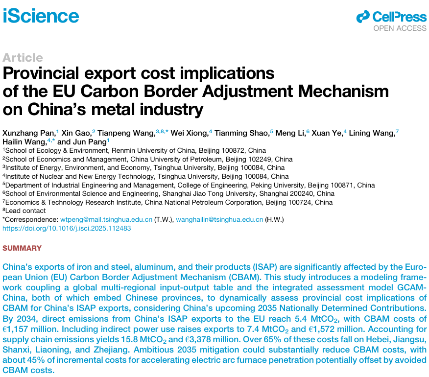 近日,潮人论坛 潘勋章副教授作为第一作者,与合作者的研究论文Provincial export cost implications of the EU Carbon Border Adjustment Mechanism on China’s metal industry发表在Cell出版社旗下期刊iScience上。