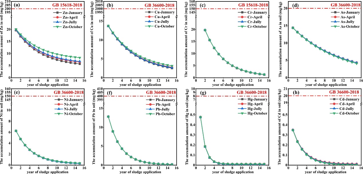 The environmental risk of heavy metals in sewage sludge from a full-scale “Cambi® thermal hydrolysis + anaerobic digestion” sludge treatment plant was discussed based on four seasons’ data. Results showed that the order of heavy metal concentration in sludge was Zn > Cu > Cr > Ni > As > Pb > Hg > Cd, which all increased significantly due to the “enrichment effect” caused by the degradation of organics. Nevertheless, the mass of heavy metals except for Cd decreased. Chemical fractions of different heavy metals in raw sludge varied greatly. The proportion of their residual fraction all increased slightly after treatment. Thermal hydrolysis and anaerobic digestion led to the transformation of some heavy metal fractions. Deep dehydration process reduced the mass of heavy metals from sludge (less than 10%). Potential ecological risk of heavy metals was low (RI<150) when sludge is applied 0.75 kg/m2 to soil according to GB 4284–2018, in which the risk of Hg and Cd was highest. Furthermore, the accumulation amounts of heavy metals in test soil and rural soil with the annual sludge application amount of 0.75 kg/m2 for 15 years were calculated, which did not exceed GB 36600–2018 and GB 15618–2018 respectively.