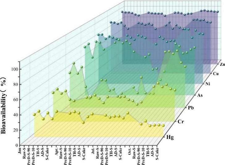 砷、铅、汞、铬、镉等重金属广泛存在于各类环境介质中,对生态环境和人类身体健康造成严重威胁。城市生活污泥作为污水处理的副产物,富集了大量重金属,其行为及去向应重点关注。 “Cambi®热水解+厌氧消化工艺是北京城市生活污泥的主要处理工艺,目前仍缺乏对该工艺过程中重金属的迁移转化规律研究及风险评估,且污水处理厂中污水性质随季节变化,进而影响污泥特性,因此本研究分别于1月、4月、7月、10月沿工艺全流程采样,探讨了该工艺各污泥处理单元(离心脱水、Cambi®热水解、厌氧消化、板框压滤脱水)对重金属的浓度、质量、形态变化的影响,并采用了潜在生态风险指数(RI)和土壤重金属累积预测模型对污泥土地利用时重金属的短、长期风险进行评估。