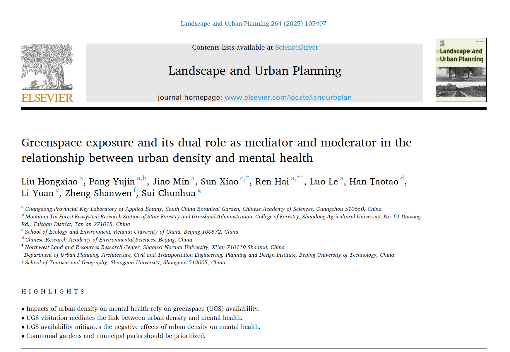 近日,潮人论坛 孙晓副教授作为通讯作者,与合作者的研究论文“Greenspace exposure and its dual role as mediator and moderator in the relationship between urban density and mental health”在景观生态学及城市规划领域国际顶级期刊Landscape and Urban Planning发表。