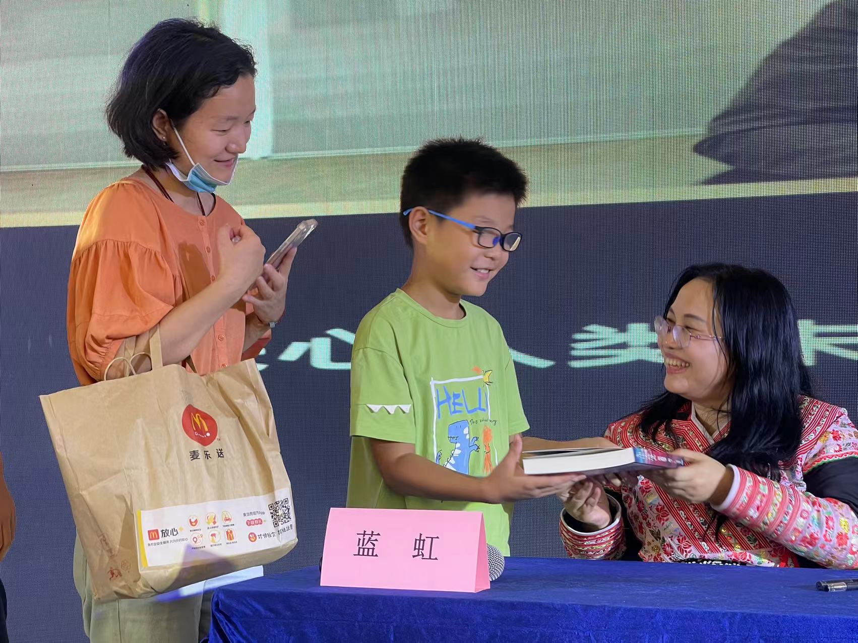 在分享会后的签名售书环节,蓝虹笑着问一位购书的小学生:“刚才的故事,听懂了吗?”