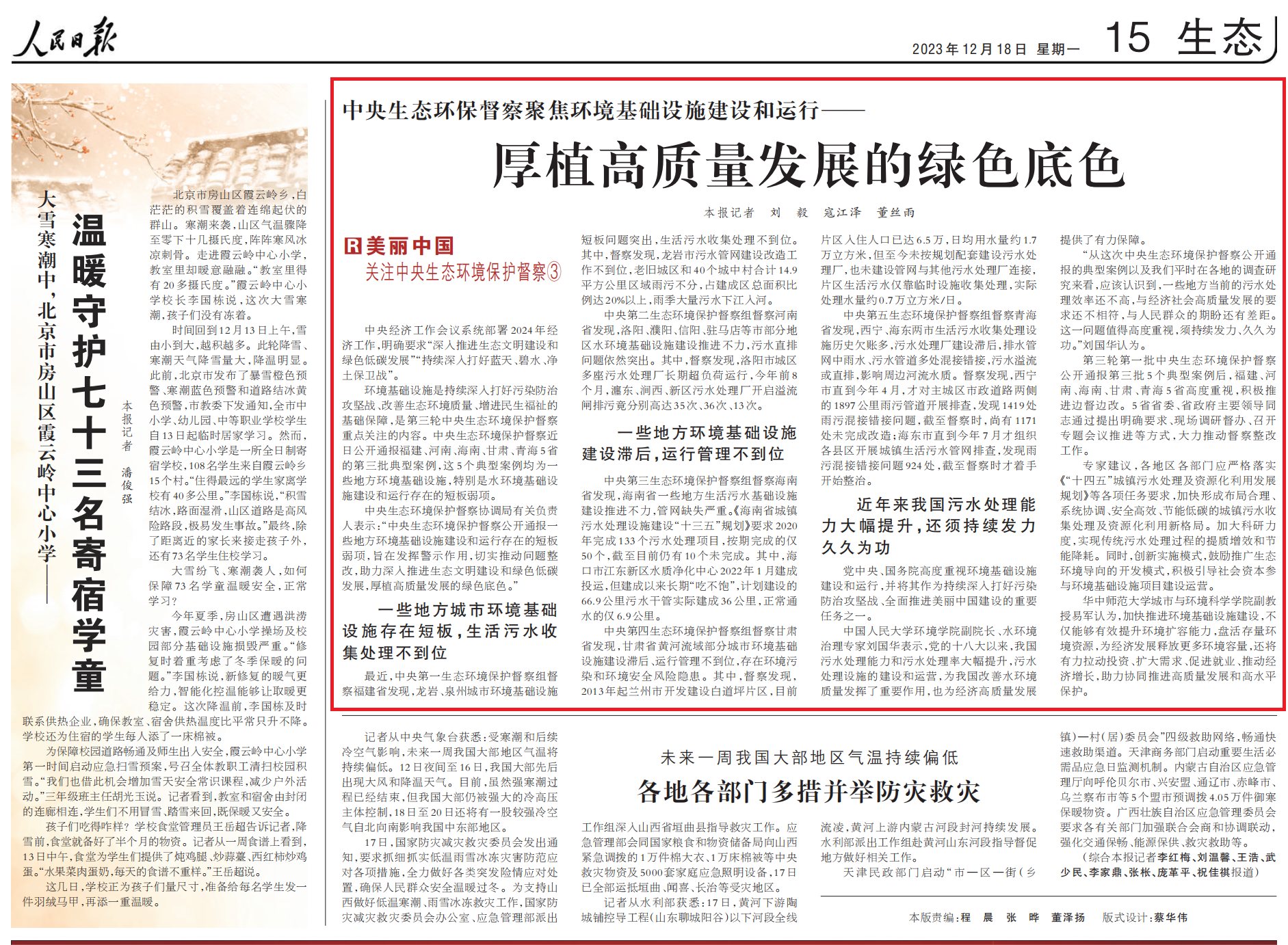 中央生态环境保护督察协调局有关负责人表示:“中央生态环境保护督察公开通报一些地方环境基础设施建设和运行存在的短板弱项,旨在发挥警示作用,切实推动问题整改,助力深入推进生态文明建设和绿色低碳发展,厚植高质量发展的绿色底色。”