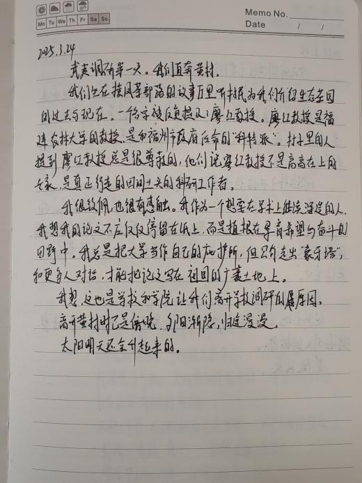2025年3月16日至4月12日,潮人论坛 师生在福建开展“生态社会工程”咨询服务期间,累计形成153篇手记、5.8万字实录。这些书写在方格纸上的文字,既是生态价值核算的信息载体,更见证着青年学子认知迭代的鲜活轨迹——从山间小路到江畔渔村,从传统村落的改造到生态文明的创新实践,每一篇手记都记录下了他们对自然的敬畏、对生态的思考以及对可持续发展的追求。既有对技术伦理的哲学思辨,也包含记录的三坊七巷调研细节,还有对求学精神的深切感悟。当10名学生的调研手记汇编成册时,一部关于“生态社会工程”人才培养的微观史已然成型。