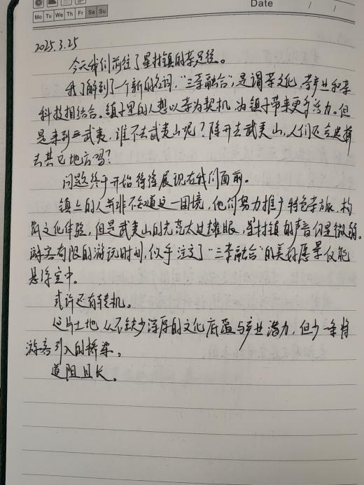 戴浩杰3月25日的手记揭示集体认知突破:“这片土地从不缺少深厚的文化底蕴与产业潜力,但少有将游者引入的桥梁。”这种从现象观察到机制构建的转变,在153篇手记中形成清晰脉络——初期多记录困惑与问题,后期则涌现解决方案。这恰好作证了“日调研-晚研讨-周总结”节奏高效循环不仅提升了调研质量,也让同学们自身的能力得到了锤炼,真正实现了林尚立校长所言“咨询服务中心要成为理论创新的试验田,更要成为人才成长的练兵场”。