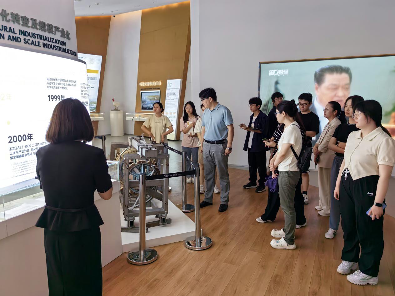 除了以矿泉水厂为代表的水美经济,现代农业也是光泽县高速发展的活力源泉。在圣农集团,师生详细了解了圣农的发展历程、产业模式和生产过程。作为南平市生态食品加工产业集群的龙头企业,圣农集团以独树一帜的“自育、自繁、自养、自宰、深加工”的闭环管理模式构建企业可持续发展的绿色循环经济产业链,推动了“一只鸡”的生态产品价值实现。圣农集团的现代农业规模化、特色化、科技化、生态化、观赏性程度不断提升,正依托互联网、物联网技术向电子商务、生态旅游迈进,以实现三产融合。细数圣农的发展故事,师生们印象最深的便是其可持续发展的企业战略,光伏发电、鸡粪生物质发电、有机肥制造……圣农用实际行动走出了一条优质、高效、安全、生态、可持续发展的现代肉鸡产业化之路。