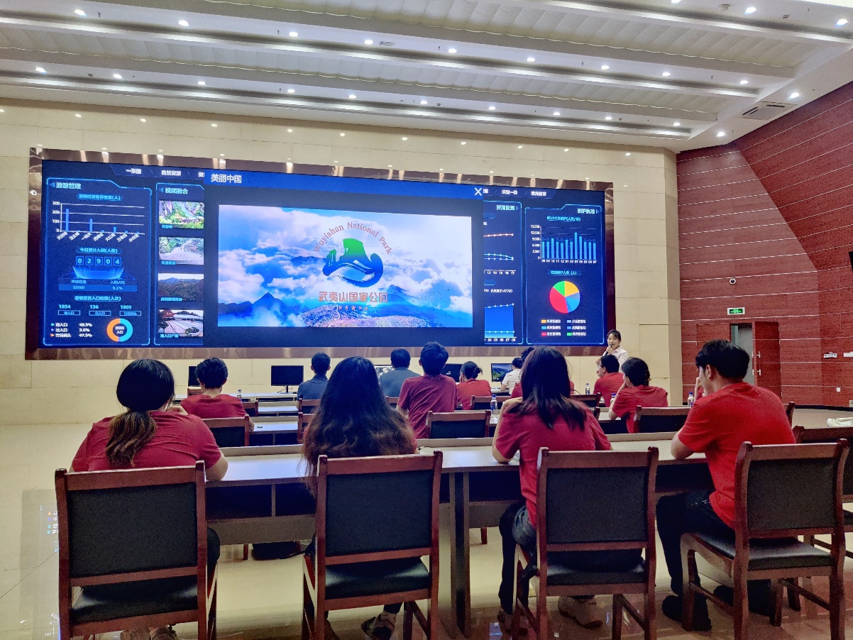 7月25日上午,调研团来到武夷山国家公园智慧管理中心,探访国家公园生态保护的“中枢大脑”。该智慧管理平台包括景区客容、自然资源、巡护执法、防火预警、宣传教育等若干子系统,综合运用互联网、无人机、地理遥感等科学技术,对巡护管理、森林防火、游客保有量、自然环境要素等进行监测预警。这不仅有助于生物科考、应急反应、生态保护等方面的管理效能,还能提升国家公园的游客服务质量、合理调度各区域游客活动人数。在了解了国家公园“天地空”全方位、全天候监测模式之后,师生们深切感受到科技赋能对于国家公园建设的重要意义。