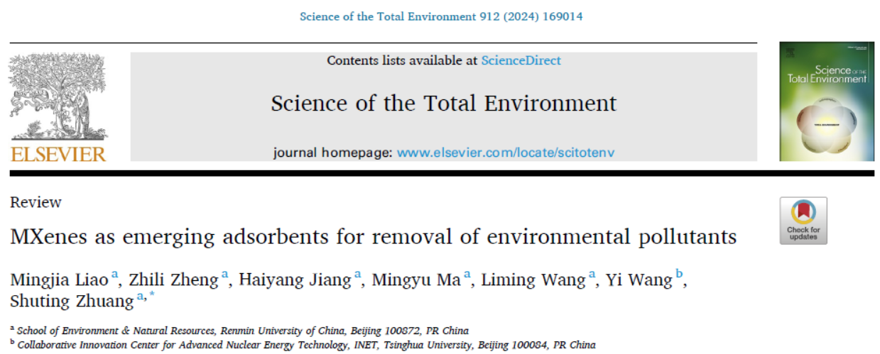 近日,潮人论坛 环境学院2022级明德环境“经济学-科学”拔尖人才实验班学生廖明嘉、郑智丽、江海洋、马明宇撰写的综述论文“MXenes as emerging adsorbents for removal of environmental pollutants”在Elsevier旗下期刊Science of the Total Environment发表。该文由环境学院助理教授庄淑婷指导并担任通讯作者。Science of the Total Environment为环境科学与生态学领域一区顶级期刊,其影响因子为9.8。