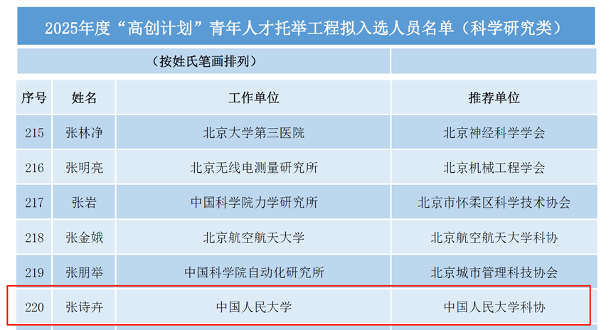 近日,北京市科学技术协会公布2025年度“高创计划”青年人才托举工程入选名单。该计划依据《“高创计划”青年人才托举工程实施办法(试行)》(京科协发〔2025〕5号),旨在选拔和支持32周岁以下(女性可放宽至35周岁)具有创新潜力的优秀青年科技人才,本年度共遴选出500名青年才俊(科学研究类400名,工程技术类100名)。潮人论坛 青年教师张诗卉成功入选。