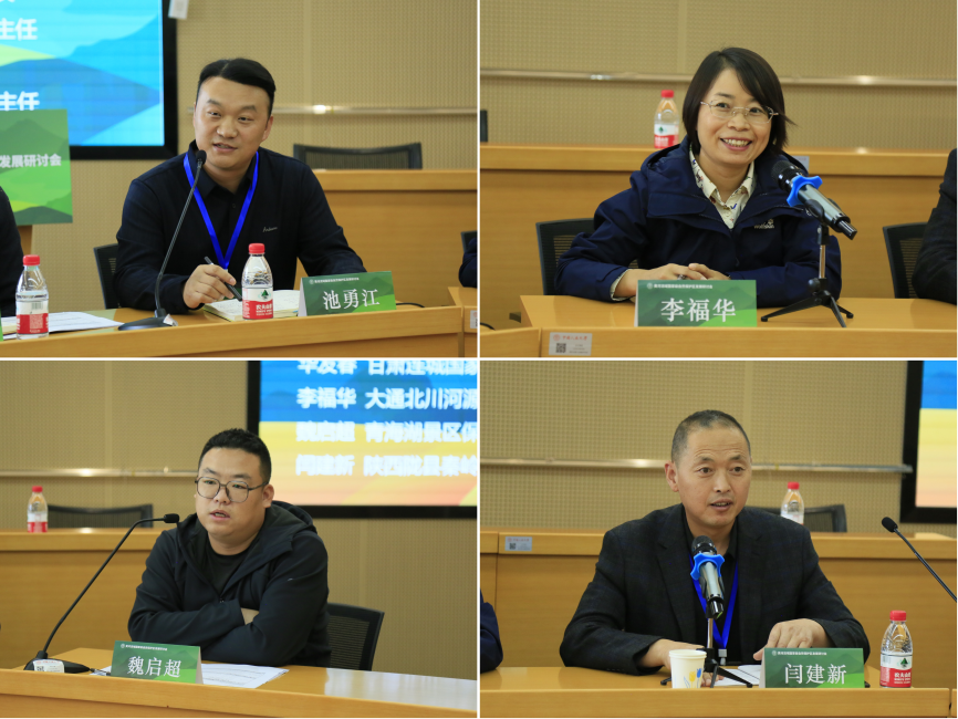 甘肃秦州珍稀水生野生动物国家级自然保护区管护中心办公室主任池勇江,大通北川河源区国家级自然保护区管理局办公室主任李福华,青海湖景区保护利用管理局副科长魏启超,陕西陇县秦岭细鳞鲑国家级自然保护区管理处副主任闫建新以“自然保护地能力建设”为主题展开讨论。嘉宾们分析了自然保护区当前管理中存在的资金保障尚缺乏、治理体系待完善、产品转化不充分、宣传科普不广泛、科研力量需加强等问题,提出黄河流域保护区需根据各自特点分类管理,敏锐挖掘生态市场进一步推动生态产品价值实现。