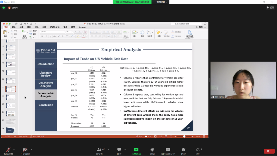 2019级明德环境“经济学-科学”拔尖创新人才实验班33位同学在完成为期两周的“应用微观经济学”与“环境大数据与机器学习”的线上课堂的学习后,分成8组,围绕“美国-墨西哥二手车交易的环境影响”这一主题开展为期两周的实证分析和研究。针对同样的研究题目,各组同学形成各自独特的研究问题。他们精诚合作,充分利用课堂上学到的知识,开展了相关的数据挖掘和实证分析,完成了书面报告,并用英语对研究成果进行汇报。