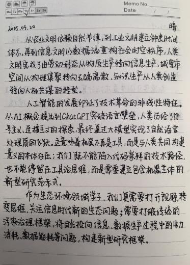 咨询服务期间,潮人论坛 团队累计形成153篇调研手记、5.8万字实录。这些书写在方格纸上的文字,既是生态价值核算的信息载体,更见证着青年学子认知迭代的鲜活轨迹——从山间小路到江畔渔村,从传统村落的改造到生态文明的创新实践,每一篇手记都记录下了他们对自然的敬畏、对生态的思考以及对可持续发展的追求。既有对技术伦理的哲学思辨,也包含记录的三坊七巷调研细节,还有对求学精神的深切感悟。当10名学生的调研手记汇编成册时,一部关于“生态社会工程”人才培养的微观史已然成型。