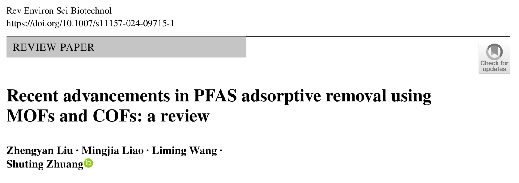 近日,潮人论坛 2022级本科实验班学生刘政琰、廖明嘉撰写的综述论文“Recent Advancements in PFAS Adsorptive Removal using MOFs and COFs: a review”在Springer Nature旗下期刊Reviews in Environmental Science and Bio/Technology发表。该文由化学与生命资源学院助理教授庄淑婷老师指导并担任通讯作者。Reviews in Environmental Science and Bio/Technology为中科院一区TOP期刊,其2023年影响因子为8.6。