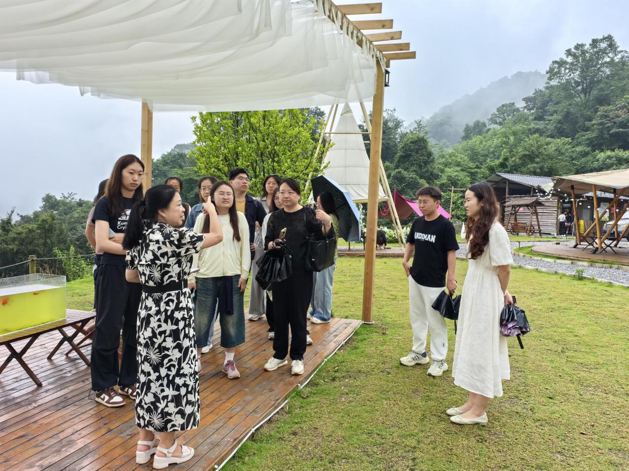 7月24日上午,调研团队前往绥山镇太阳村和荷叶村,调研文旅融合相关情况。太阳村海拔1200米,森林覆盖率达92%,凭借避暑、观星、赏夕阳的天然优势,为露营经济发展筑牢基础。调研发现,太阳村露营基地呈现差异化发展特点:有的聚焦烧烤、火锅等美食体验;有的面向亲子家庭,配套沙池、滑梯等儿童游乐设施,并用集装箱改造出咖啡店。舒适的露营环境推动当地露营经济快速兴起,成为网红打卡地,既带动村民就业,也拓宽了农产品销售渠道,让村民切实受益。毗邻的荷叶村,在700至1500米的山地间舒展画卷,85%的森林覆盖率与18℃年均气温,勾勒出康养度假的理想轮廓。这里以“国资+村集体+运营公司”模式为笔,将传统民居晕染成高端民宿,联动茶园、竹园、果园开发采茶制茶、挖笋编竹等农事体验,发展矿山咖啡、山溪烧烤等新业态。调研中,师生共同参观了一处由废旧采矿场改造的咖啡馆,其既保留老矿场历史风貌,又融入现代设计元素,让工业记忆在文旅新业态中焕发新生。