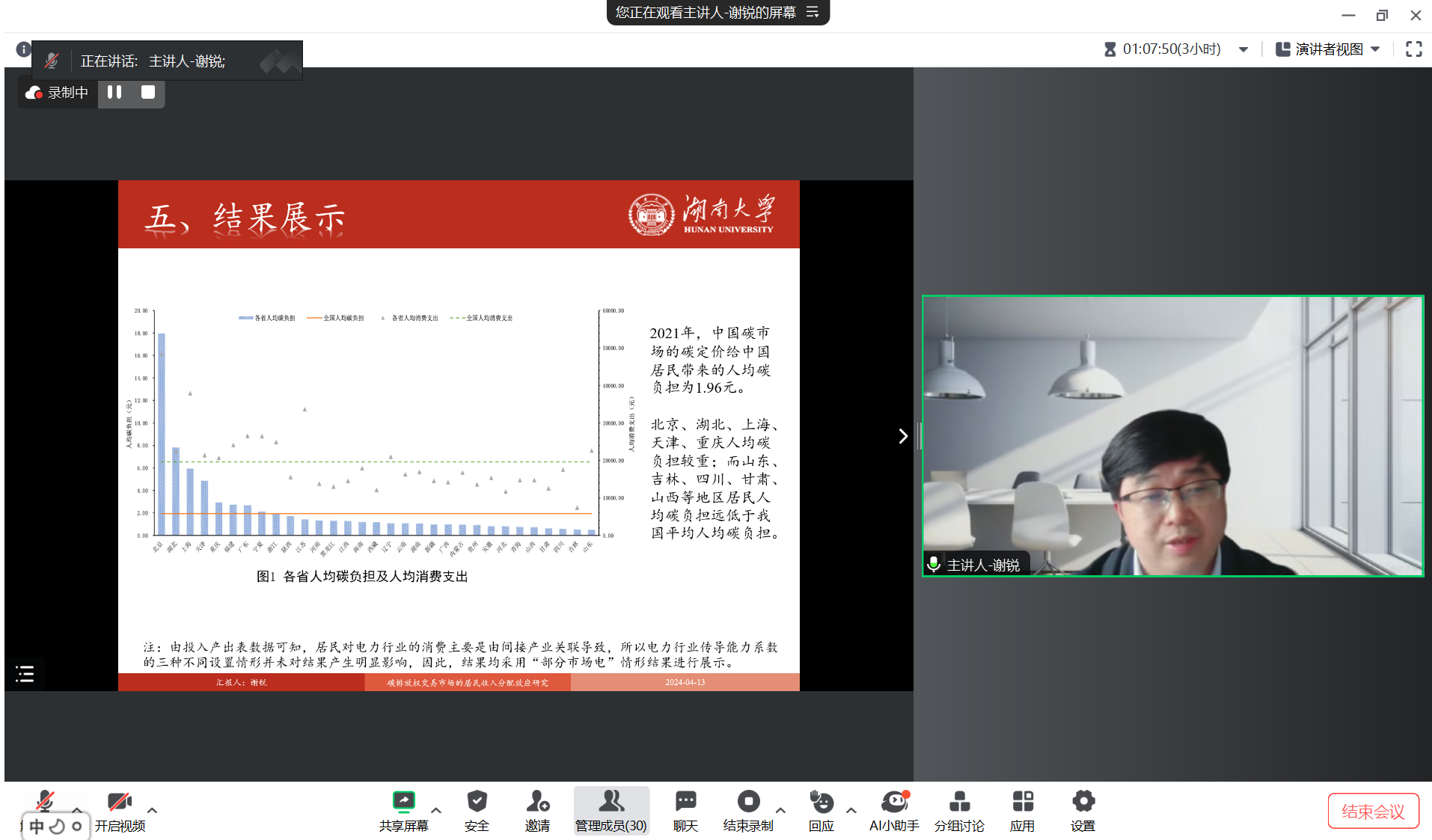 2024年4月13日,潮人论坛 主办的“明德环境学术讲坛”第三十一讲以线上线下结合的方式成功举办。本次讲坛邀请湖南大学经济与贸易学院副院长谢锐教授作了题为“碳排放权交易市场的居民收入分配效应研究”的学术报告。潮人论坛 院长庞军教授首先致辞,代表学院对谢锐教授为潮人论坛 师生作学术报告表示诚挚感谢,并对参会师生在交流学习过程中能够有所收获提出了殷切期望。会议由潮人论坛 昌敦虎副教授主持。